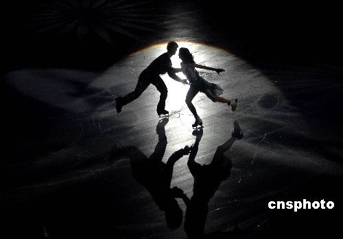 2009年4月12日晚,第十一屆全國(guó)運(yùn)動(dòng)會(huì)青島市賽區(qū)組委會(huì)在國(guó)信體育館舉行了花樣滑冰優(yōu)秀運(yùn)動(dòng)員專場(chǎng)表演晚會(huì)。獲得男、女單人滑、雙人滑、冰舞的前四名選手悉數(shù)登場(chǎng),在絢麗多彩的燈光和音樂(lè)伴奏下,為觀眾獻(xiàn)上了精彩絕倫的表演。至此,第十一屆全國(guó)運(yùn)動(dòng)會(huì)花樣滑冰比賽完美謝幕。中新社發(fā) 楚天行 攝