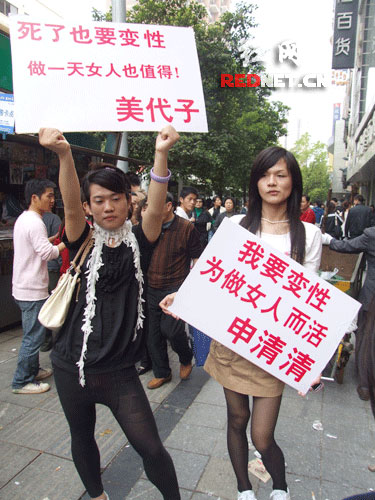 13日下午13時(shí)左右,記者收到網(wǎng)友線(xiàn)索,長(zhǎng)沙黃興路步行街有兩個(gè)怪人舉著“我要變性”的標(biāo)牌,圍觀的市民把路口堵個(gè)水泄不通。記者隨后趕到,發(fā)現(xiàn)其中一人正是前段時(shí)間頻頻曝光的“準(zhǔn)”變性人申清清,另一個(gè)“怪人”則自稱(chēng)“美代子”。