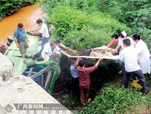 記者在現(xiàn)場找到客車司機(jī),他說,事發(fā)時,前面有一輛摩托車發(fā)生側(cè)翻,他為避讓摩托車踩剎車,客車撞斷那花橋四五根護(hù)欄后,側(cè)翻在水溝邊?蛙囀艿絼×业乃ぢ浜笫軗p嚴(yán)重,里面的乘客被困多人。他受傷較輕,急忙爬出來后,又鉆進(jìn)車廂里救人,共救了幾個人。他說,客車從蘇圩發(fā)車前往南寧,當(dāng)時車上只有30人左右,沒有超載。
