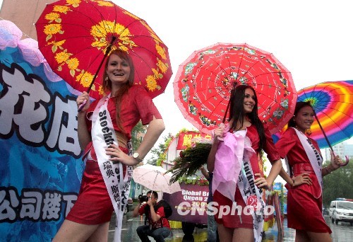 7月21日,“環(huán)球皇后”佳麗冒雨在牡丹江市街頭參加巡游活動。當(dāng)日,黑龍江省牡丹江市出現(xiàn)降雨天氣。上午9時,來自世界各地的60余名“環(huán)球皇后”佳麗乘坐20余輛花車,冒雨亮相在牡丹江城區(qū)主要道路。據(jù)悉,當(dāng)晚,2009年“環(huán)球皇后”大賽的“最佳才藝”單項獎將在牡丹江市角逐產(chǎn)生。中新社發(fā) 莊文斌 攝