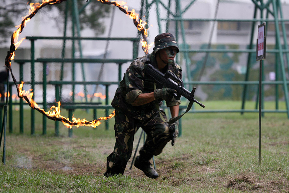 本網(wǎng)記者近日在中國人民解放軍駐香港部隊(duì)石崗營區(qū)訓(xùn)練場,觀看了駐港部隊(duì)偵察兵實(shí)彈突擊演練。身穿迷彩服、面涂油彩的戰(zhàn)士們冒著“槍林彈雨”,背負(fù)槍械攻克障礙,其間穿越火障、跨越滑橋、潛灘暗渡,更肩扛一百公斤的圓木進(jìn)行二百米極限沖刺。這些障礙項(xiàng)目是對戰(zhàn)士意志、體力與心理的多重磨練,連續(xù)通過二十一個項(xiàng)目,更是挑戰(zhàn)體能的極限。鄭祚聲 攝