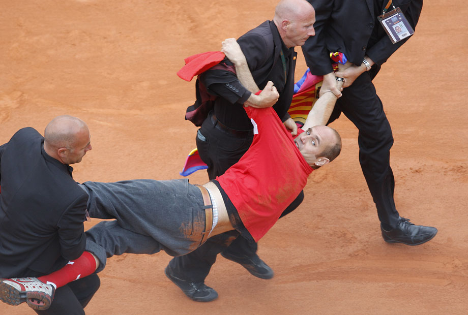 法網(wǎng)男單決賽場(chǎng)上,一位費(fèi)天王的癡心球迷沖入球場(chǎng),強(qiáng)行將自制的一頂帽子戴到費(fèi)德勒的頭上。安保人員及時(shí)出現(xiàn),將狂熱粉絲架出場(chǎng)外。