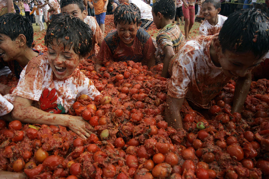 2009年6月14日,哥倫比亞第五屆番茄狂歡節(jié)開幕,參與者互相投擲西紅柿,盡情狂歡慶豐收。來自哥倫比亞各地的狂歡者們?cè)萍谑锥疾ǜ绱髺|北部的蘇塔馬錢小鎮(zhèn),街道上立刻變成了西紅柿紛飛的戰(zhàn)場。雖然每個(gè)人的臉上身上沾滿了西紅柿汁,但人們還是樂此不疲又是丟又是砸,把成堆的西紅柿當(dāng)成打仗的“武器”。還有人特地穿上白衣白褲,身上越紅,心里就越痛快。