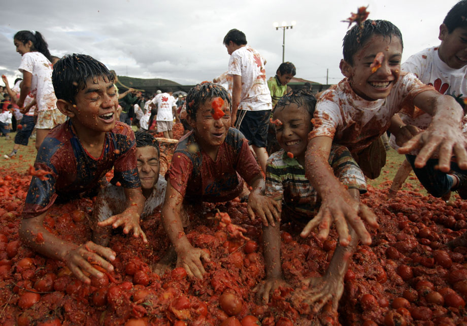 2009年6月14日,哥倫比亞第五屆番茄狂歡節(jié)開幕,參與者互相投擲西紅柿,盡情狂歡慶豐收。來自哥倫比亞各地的狂歡者們云集在首都波哥大東北部的蘇塔馬錢小鎮(zhèn),街道上立刻變成了西紅柿紛飛的戰(zhàn)場。雖然每個人的臉上身上沾滿了西紅柿汁,但人們還是樂此不疲又是丟又是砸,把成堆的西紅柿當成打仗的“武器”。還有人特地穿上白衣白褲,身上越紅,心里就越痛快。