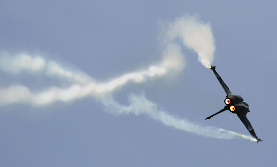 圖為法國(guó)陣風(fēng)戰(zhàn)斗機(jī)進(jìn)行飛行表演。