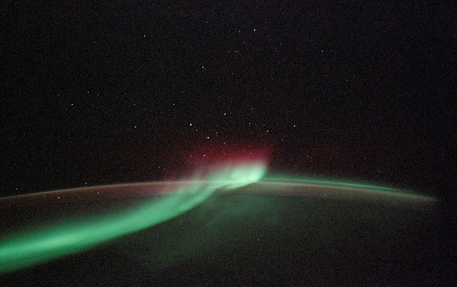 在兩極上空大氣層以上數(shù)十公里的太空,極光現(xiàn)象仍能被清楚地觀測到。紅色、綠色的極光閃爍著怪異的微弱綠光,好似鬼怪之光,給人以寒冷的感覺。在繞地軌道上的宇航員用長曝光相機和35毫米膠片拍攝下了這些怪異的圖片。