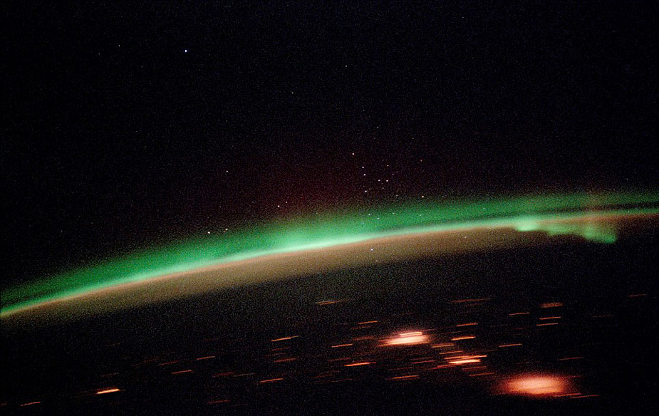 在兩極上空大氣層以上數(shù)十公里的太空,極光現(xiàn)象仍能被清楚地觀測到。紅色、綠色的極光閃爍著怪異的微弱綠光,好似鬼怪之光,給人以寒冷的感覺。在繞地軌道上的宇航員用長曝光相機(jī)和35毫米膠片拍攝下了這些怪異的圖片。