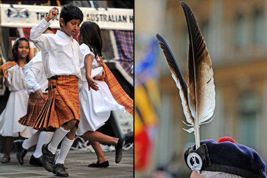 2009年7月1日,澳大利亞當(dāng)?shù)氐奶K格蘭籍男女老少,頭插羽毛、身穿格子裙、吹著蘇格蘭風(fēng)笛來到悉尼市中心,慶祝屬于他們的節(jié)日“蘇格蘭格子日”。