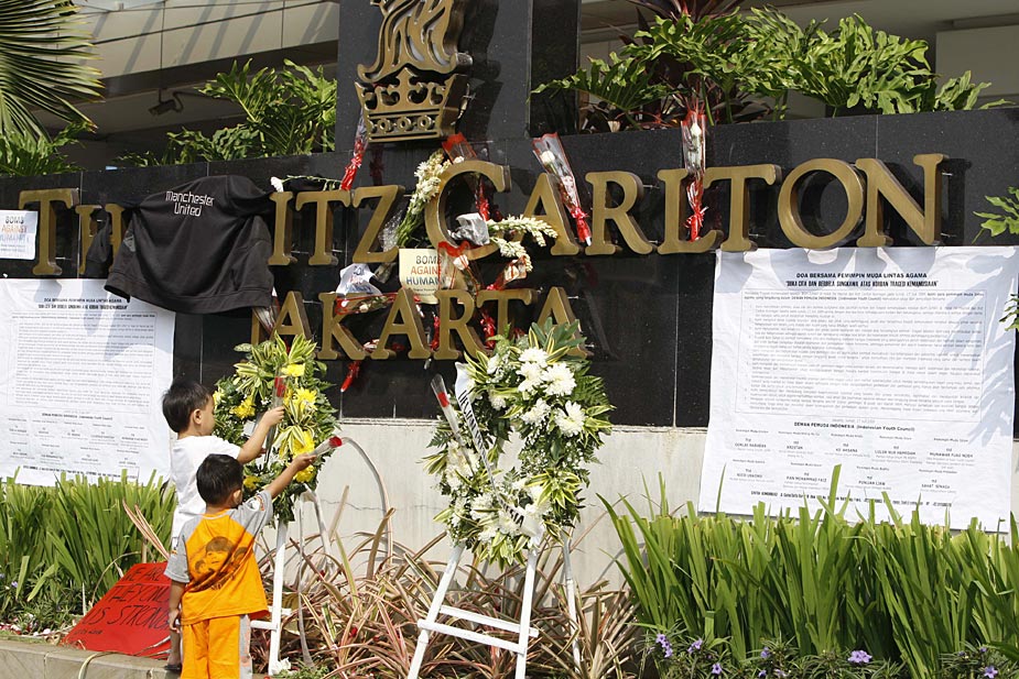 7月18日,印度尼西亞首都雅加達(dá)的民眾紛紛來(lái)到發(fā)生爆炸的萬(wàn)豪酒店和麗嘉酒店,向死難者獻(xiàn)花表示哀悼。