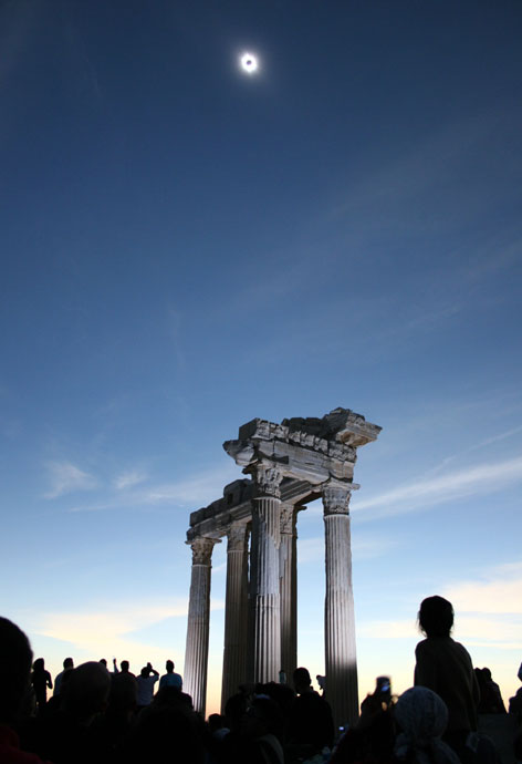 圖為2006年3月29日,在土耳其阿波羅神廟前人們正在觀測(cè)日全食景觀。