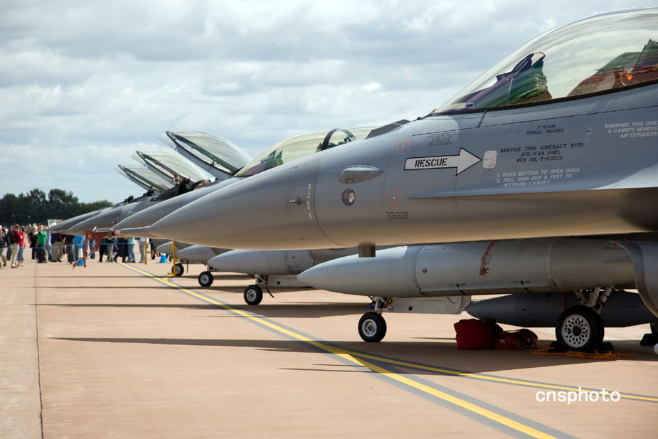 2009年7月,“2009英國費(fèi)爾福德航展”在英格蘭費(fèi)爾福德開展。圖為費(fèi)爾福德航展上,來自各國空軍的F-16戰(zhàn)斗機(jī)在停機(jī)坪上依次排開,氣勢逼人。中新社發(fā) 潘禹 攝