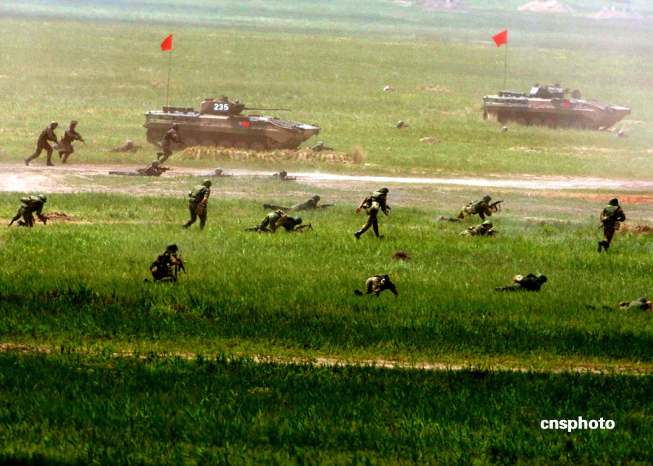 中國、俄羅斯兩軍總參謀長,7月23日上午到沈陽軍區(qū)洮南合同戰(zhàn)術(shù)訓(xùn)練基地,觀看“和平使命2009”聯(lián)合反恐軍事演習(xí)。雙方以陸軍和空軍為主,中方參演部隊包括1個陸軍戰(zhàn)斗群和1個空軍戰(zhàn)斗群。俄方參演兵力包括1個陸軍加強摩步營、1個空降突擊連和部分空軍兵力,雙方投入兵力兩千多人。中新社發(fā) 宋吉河 攝