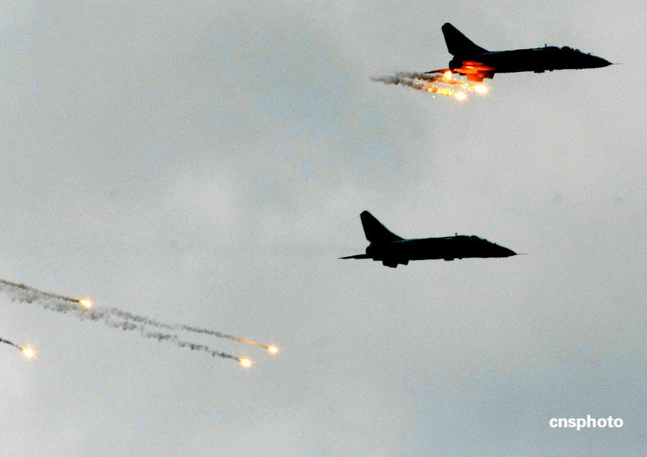 中國、俄羅斯兩軍總參謀長,7月23日上午到沈陽軍區(qū)洮南合同戰(zhàn)術(shù)訓練基地,觀看“和平使命2009”聯(lián)合反恐軍事演習。雙方以陸軍和空軍為主,中方參演部隊包括1個陸軍戰(zhàn)斗群和1個空軍戰(zhàn)斗群。俄方參演兵力包括1個陸軍加強摩步營、1個空降突擊連和部分空軍兵力,雙方投入兵力兩千多人。中新社發(fā) 宋吉河 攝
