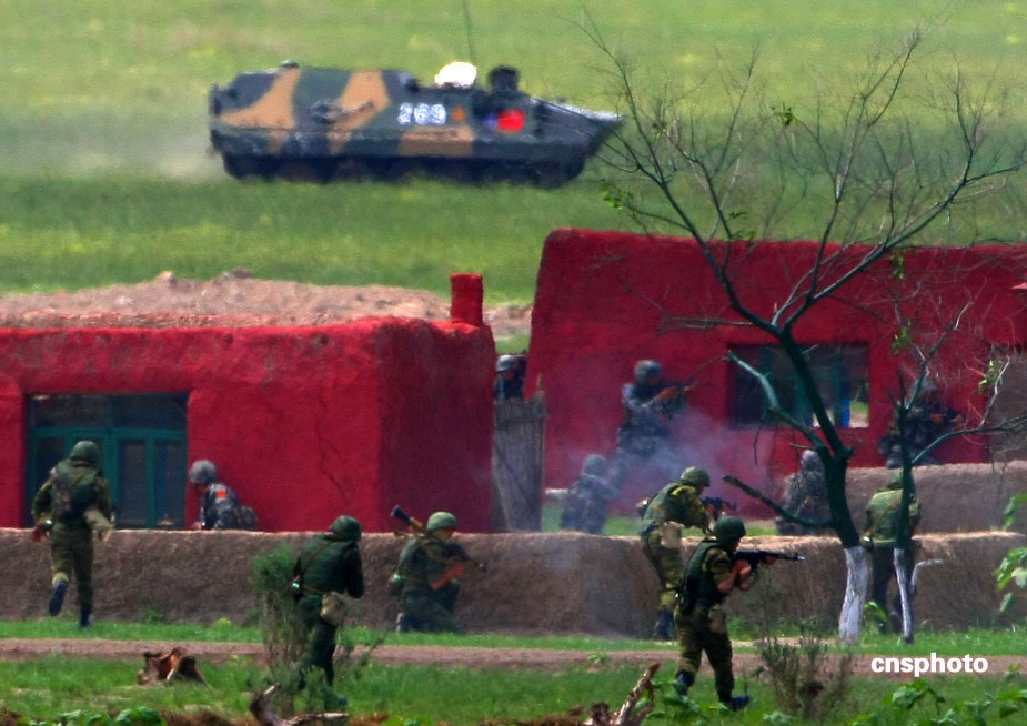 中國、俄羅斯兩軍總參謀長,7月23日上午到沈陽軍區(qū)洮南合同戰(zhàn)術(shù)訓(xùn)練基地,觀看“和平使命2009”聯(lián)合反恐軍事演習(xí)。雙方以陸軍和空軍為主,中方參演部隊包括1個陸軍戰(zhàn)斗群和1個空軍戰(zhàn)斗群。俄方參演兵力包括1個陸軍加強摩步營、1個空降突擊連和部分空軍兵力,雙方投入兵力兩千多人。中新社發(fā) 宋吉河 攝