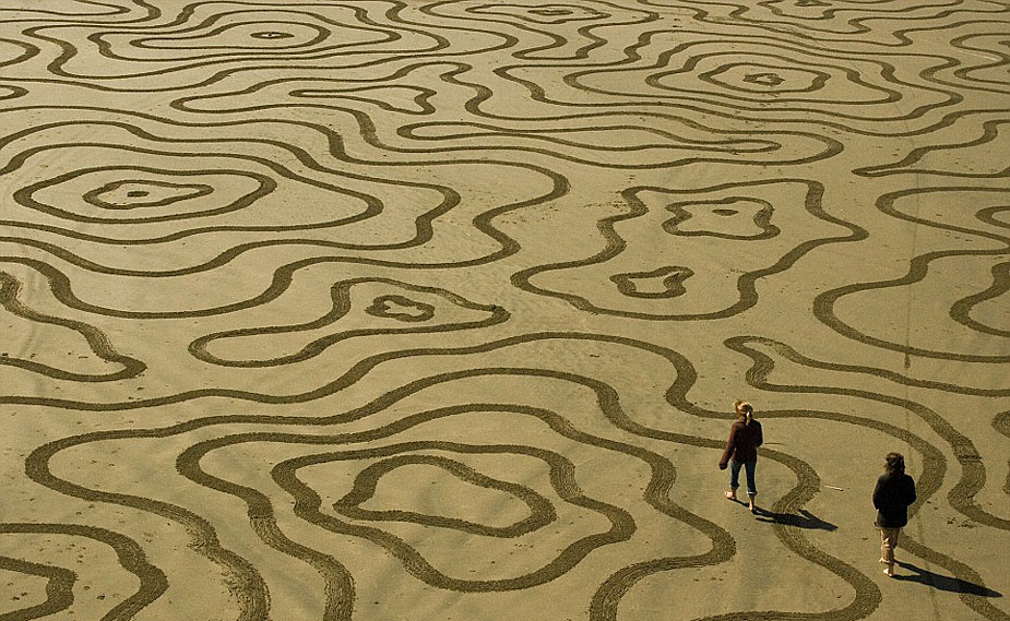 據(jù)英國媒體7月27日?qǐng)?bào)道,藝術(shù)家Andres Amador用耙子在沙灘上作畫,眾多中心對(duì)稱的幾何圖形,不在乎是否能長久保留,但求被海浪帶走前與大自然的完美融合。