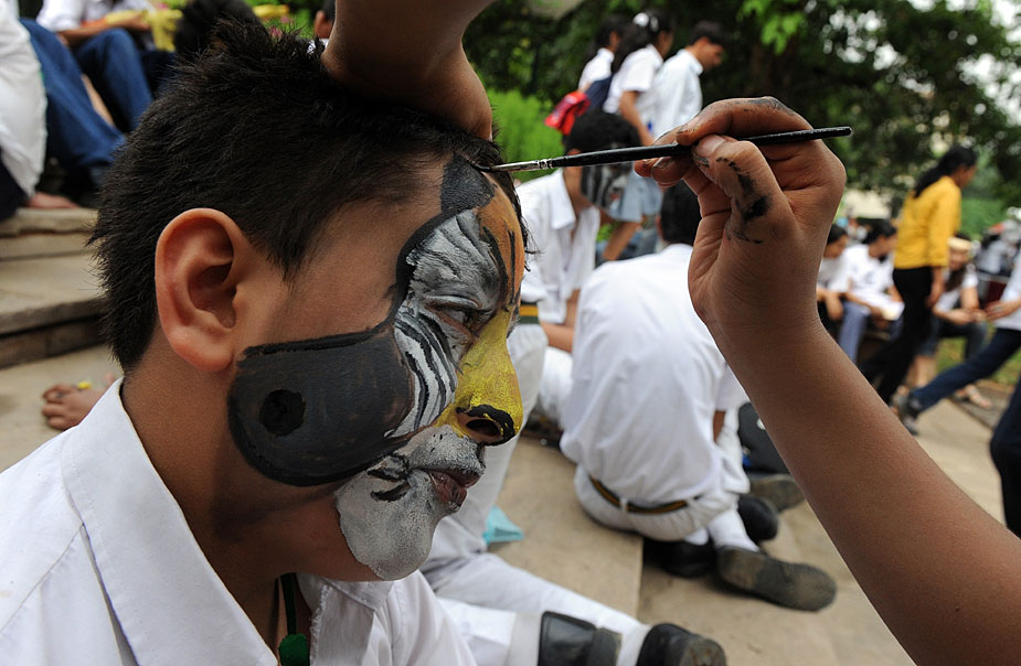 7月28日,約2000名學生在新德里化妝成老虎的臉譜,圍坐成老虎的造型,與官員和野生動物專家們一起呼吁人們保護孟加拉虎和其他野生動物。