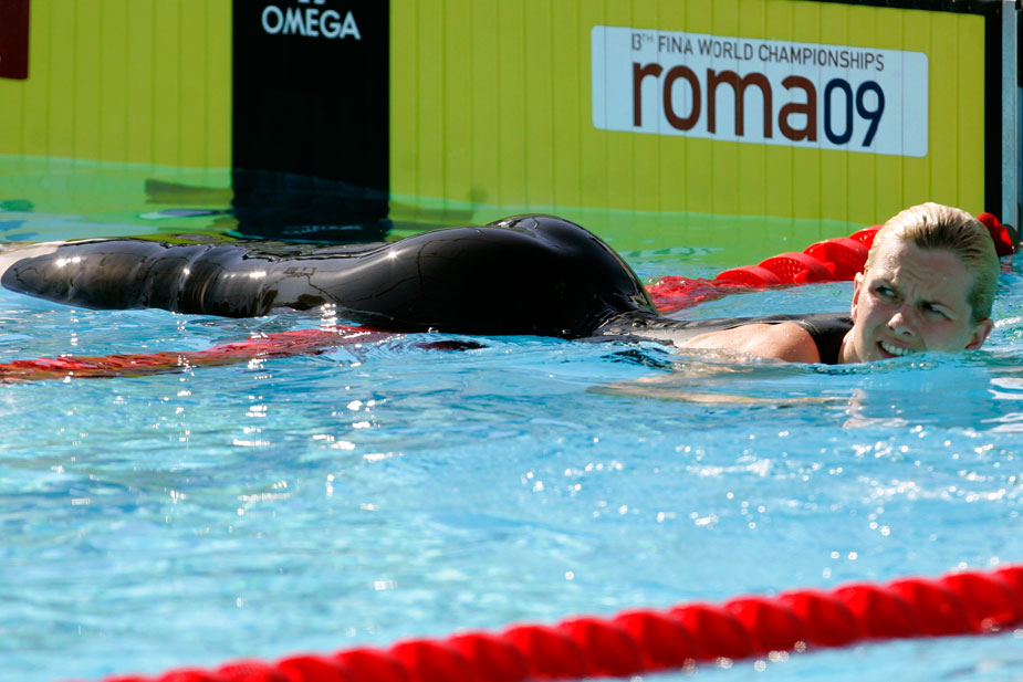 “有腳的美人魚”——7月30日,布麗塔·斯特芬在女子100米自由泳預(yù)賽后橫跨泳道線秀美臀。