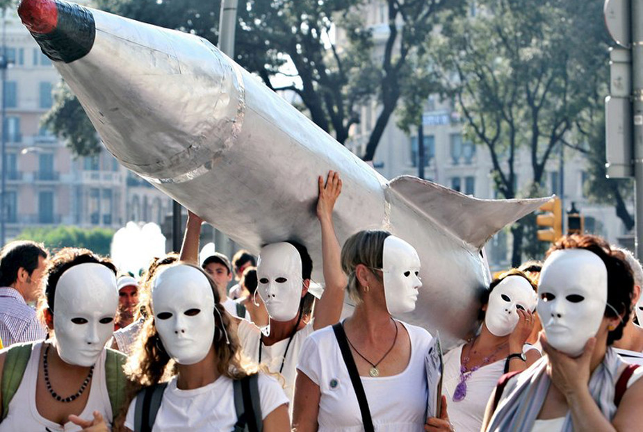 西班牙巴塞羅那,人們帶著面具舉行集會(huì),紀(jì)念日本廣島遭原子彈轟炸64周年。