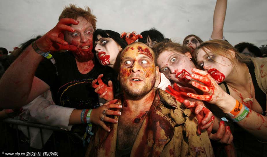 2009年8月6日,英國(guó)赫里福德郡Eastnor城堡,人們化裝成“僵尸”出現(xiàn)在大寒音樂(lè)節(jié)上,欲打破同一地點(diǎn)聚集最多“僵尸”的世界紀(jì)錄。
