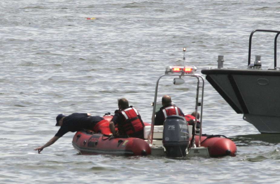 8月8日,紐約市曼哈頓西側(cè)的哈德遜河上空,一架觀光直升飛機和一架小型飛機相撞,兩飛機雙雙墜入河中。據(jù)稱觀光直升飛機上載有五名意大利游客和一名飛行員,而小型飛機上則有三人。圖為工作人員在現(xiàn)場救援。