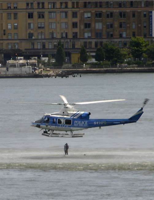 8月8日,紐約市曼哈頓西側(cè)的哈德遜河上空,一架觀光直升飛機和一架小型飛機相撞,兩飛機雙雙墜入河中。據(jù)稱觀光直升飛機上載有五名意大利游客和一名飛行員,而小型飛機上則有三人。圖為直升飛機在現(xiàn)場搜救。