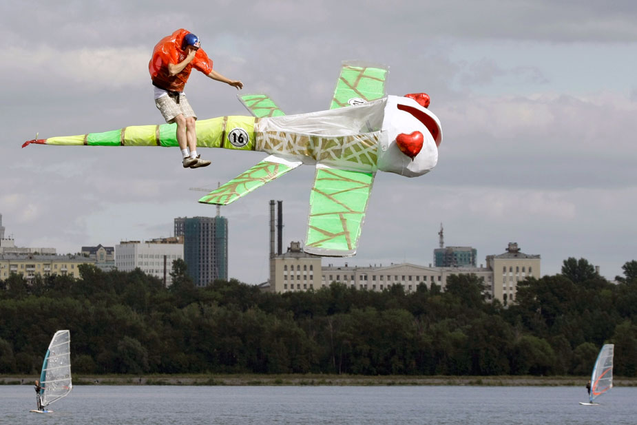 8月9日,莫斯科河畔舉辦一年一度的“墜落節(jié)”,表演者帶著自己設(shè)計(jì)制作的各種“飛行器”勇敢的從高空跳入水中。