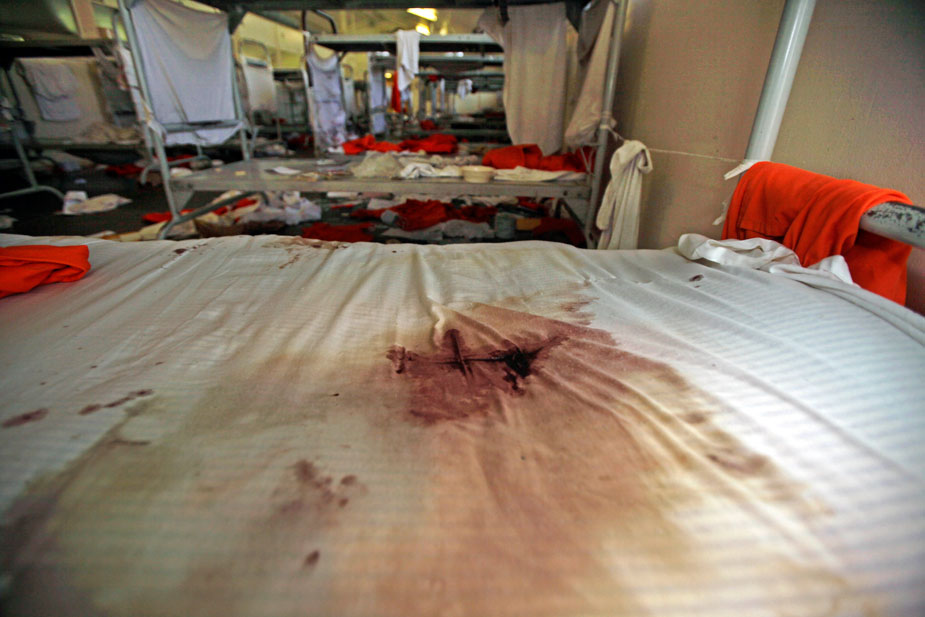 圖為奇諾監(jiān)獄宿舍被血染紅的床鋪。8月8日晚至9日凌晨,美國加州南部奇諾市發(fā)生大規(guī)模監(jiān)獄騷亂,截至目前,在250多名受傷的在押犯人中,仍有16名犯人在醫(yī)院接受治療。