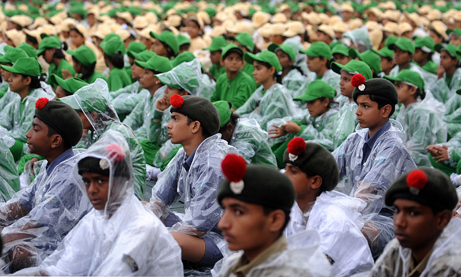 圖為印度民眾在雨中靜聽印度總理辛格的講話。