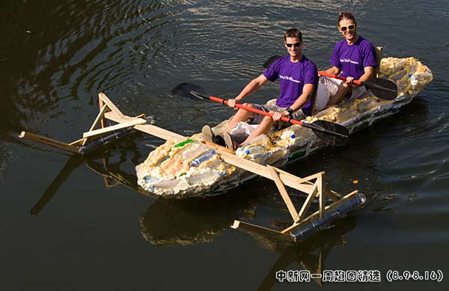 8月8日,來自新西蘭的木匠Campbell Holm和他的伙伴劃著一條由回收的塑料瓶制作的小船。點擊觀看詳細(xì)內(nèi)容