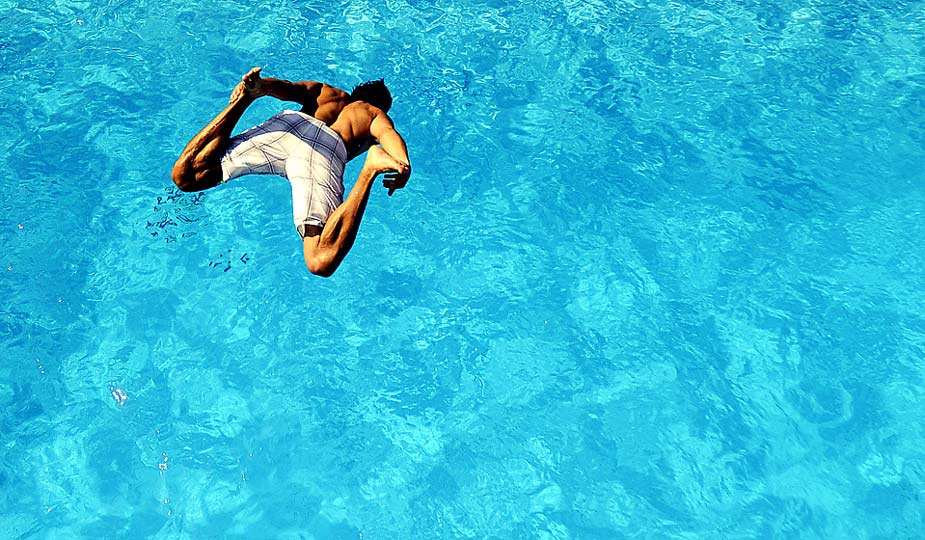 德國(guó)不萊梅,一名男子跳進(jìn)泳池避暑。