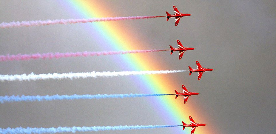 據(jù)英國媒體近日報(bào)道,英國皇家空軍“紅箭”飛行表演隊(duì)20日在英國康沃爾郡福伊港進(jìn)行飛行特技表演時(shí),恰巧天邊出現(xiàn)一道彩虹,相映成輝,異常漂亮。