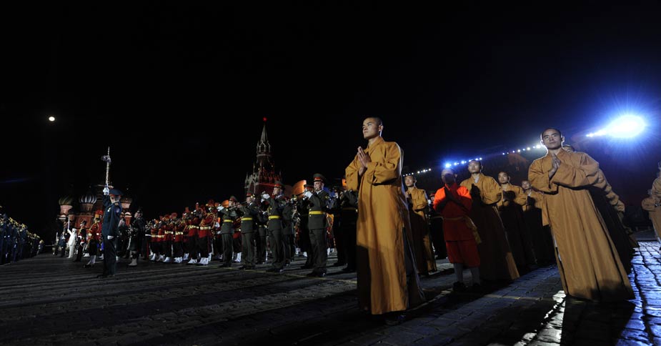 9月4日晚,在俄羅斯莫斯科紅場(chǎng)上舉行的俄羅斯國(guó)際軍樂(lè)節(jié)開(kāi)幕前夕的總彩排,中國(guó)少林武僧亮相并進(jìn)行了精彩表演。圖片來(lái)源:中國(guó)新聞網(wǎng)