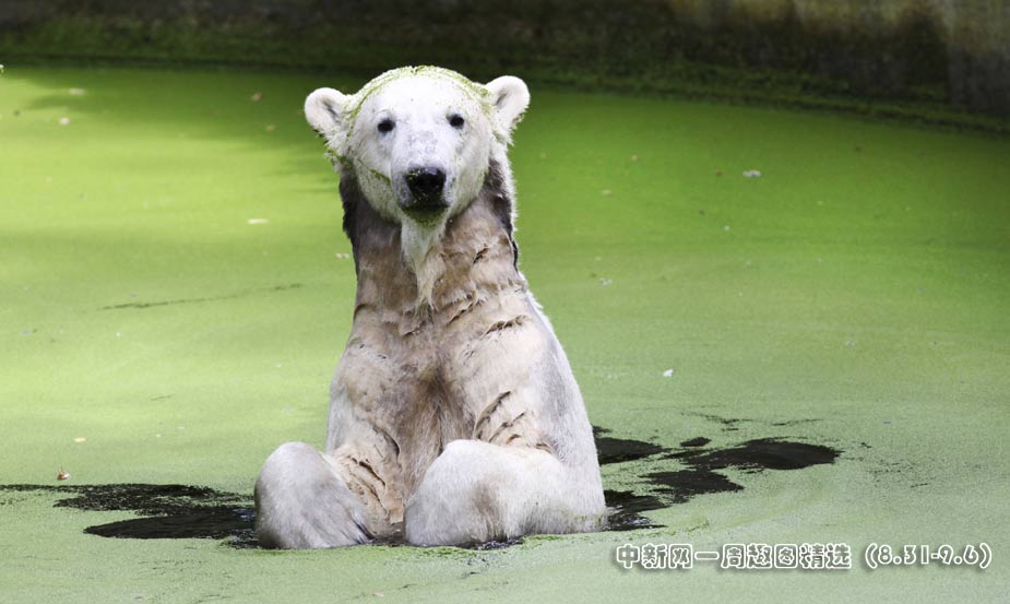 9月4日,德國柏林動(dòng)物園的明星北極熊克努特正在水中“自娛自樂”。圖片來源:中國新聞網(wǎng)