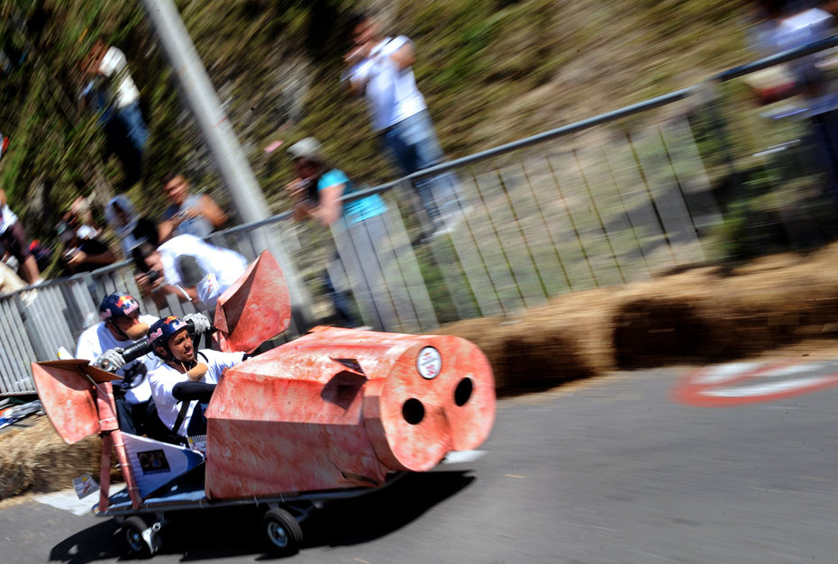 圖為參賽選手帶著自制的“豬頭”賽車(chē)參加比賽。
