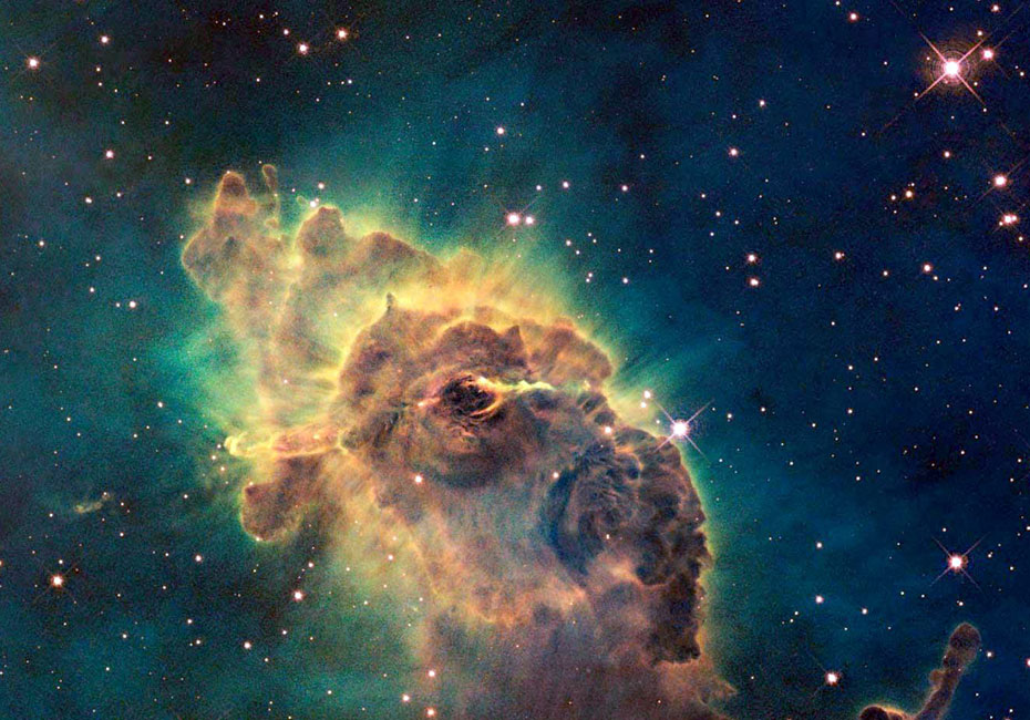 圖為哈勃望遠(yuǎn)鏡上的相機(jī)拍攝的船底座星云中的由炙熱的氣體和塵埃組成的“創(chuàng)造之柱”。船底座星云位于距離地球7500光年的船底星座,是孕育恒星的地方。