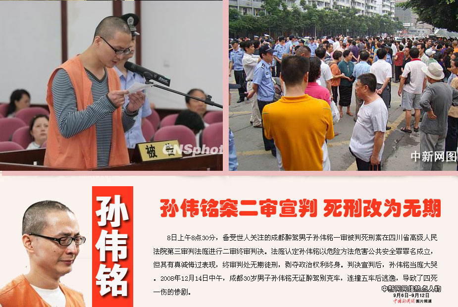 中新網(wǎng)本周熱點人物之——孫偉銘 8日上午8點30分,備受世人關注的成都醉駕男子孫偉銘一審被判死刑案在四川省高級人民法院第三審判法庭進行二審終審判決。法庭認定孫偉銘以危險方法危害公共安全罪罪名成立,但其有真誠悔過表現(xiàn),終審判處無期徒刑,剝奪政治權利終身。判決宣判后,孫偉銘當庭大哭。2008年12月14日中午,成都30歲男子孫偉銘無證醉駕別克車,連撞五車后逃逸,導致了四死一傷的慘劇。