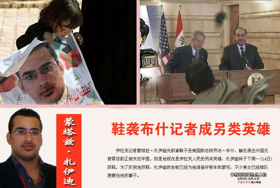 中新網(wǎng)本周熱點(diǎn)人物之——蒙塔茲·扎伊迪 伊拉克記者蒙塔茲·扎伊迪先前拿鞋子丟美國前總統(tǒng)喬治·布什,觸犯襲擊外國元首罪目前正被關(guān)在牢里。但是他現(xiàn)在是伊拉克人民的另類英雄,扎伊迪將于下周一(14日)獲釋。為了慶祝他獲釋,扎伊迪的老板已經(jīng)為他準(zhǔn)備好新車和豪宅,不少美女已經(jīng)排隊(duì)想要當(dāng)他的妻子。