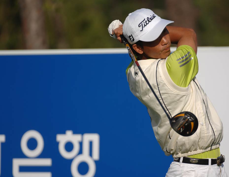 2009“韓國KEB銀行”中韓職業(yè)高爾夫球巡回賽韓國站于今天在韓國OSTAR高爾夫球俱樂部正式開桿,有47名球員代表中國參賽。圖為選手們上場第一天,揮桿開打的場面。