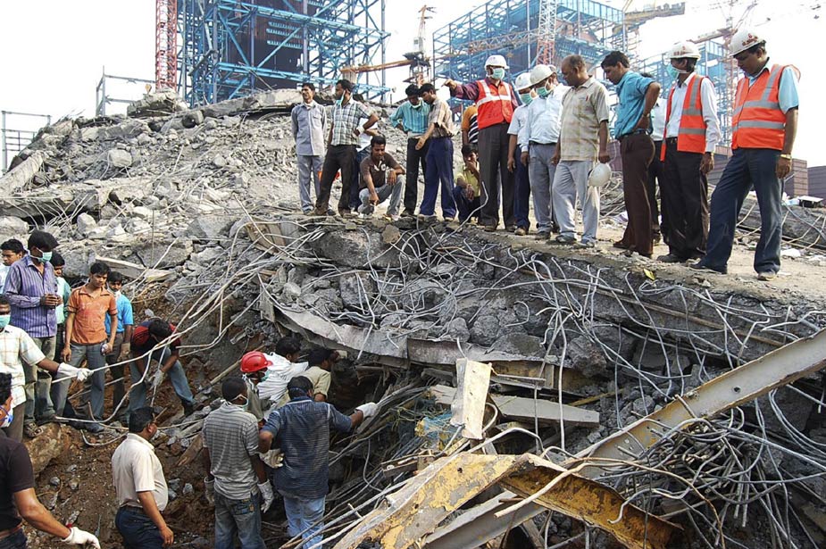 印度中部一座在建電廠的巨型煙囪23日下午發(fā)生倒塌,目前估計(jì)已有至少100人罹難。圖片來(lái)源:中國(guó)新聞網(wǎng)