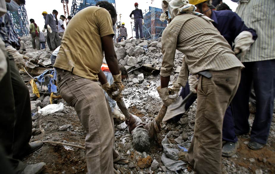 印度中部一座在建電廠的巨型煙囪23日下午發(fā)生倒塌,目前估計(jì)已有至少100人罹難。圖片來(lái)源:中國(guó)新聞網(wǎng)