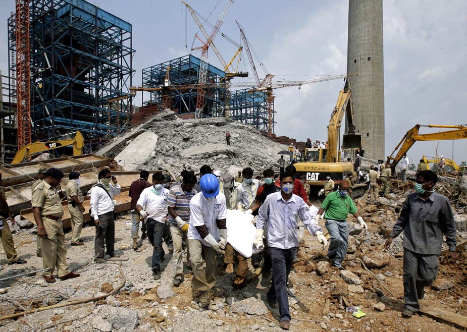 印度中部一座在建電廠的巨型煙囪23日下午發(fā)生倒塌,目前估計(jì)已有至少100人罹難。圖片來(lái)源:中國(guó)新聞網(wǎng)