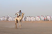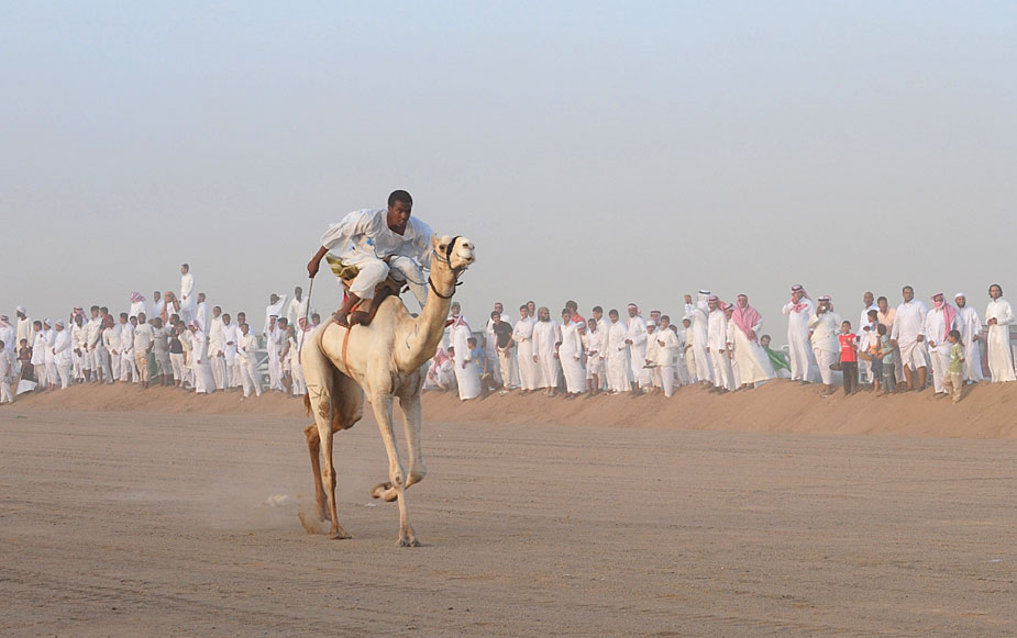 9月25日,在沙特阿拉伯東部的哈利斯,駱駝騎士們騎著自己的座駕在大漠中飛馳。圖片來源:中國新聞網(wǎng)