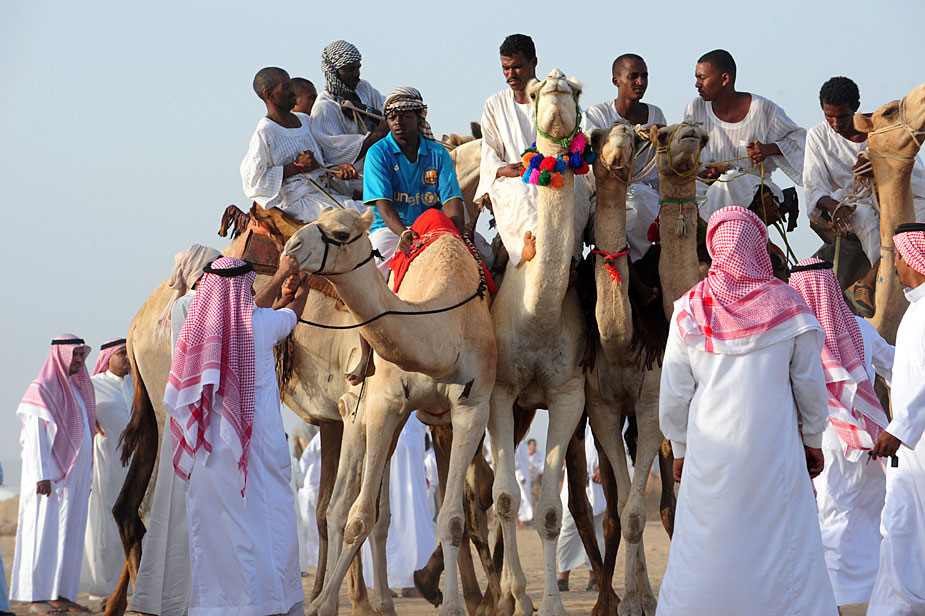 9月25日,在沙特阿拉伯東部的哈利斯,駱駝騎士們騎著自己的座駕在大漠中飛馳。圖片來源:中國(guó)新聞網(wǎng)