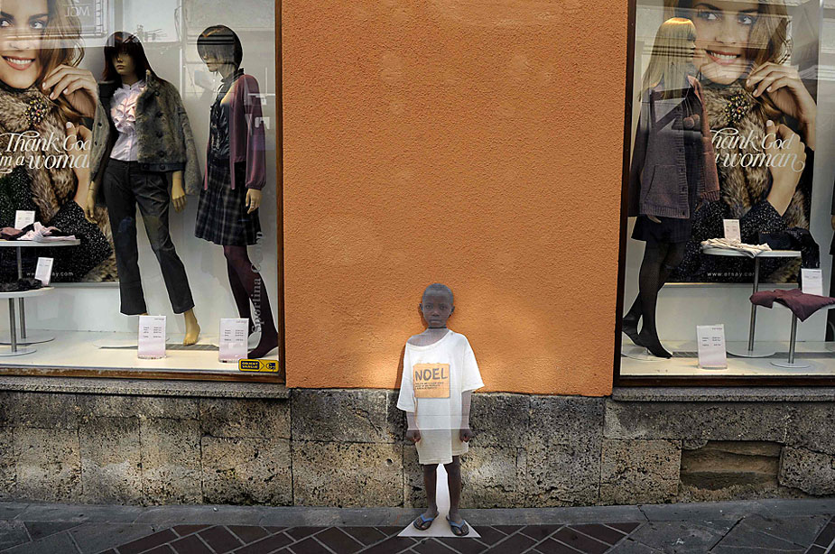 在斯洛文尼亞的盧布爾雅那街頭,聯(lián)合國兒童基金會放置了一個小乞丐的圖片紙板,以引起人們關(guān)注那些身處困境的盧旺達(dá)兒童。圖片來源:中國新聞網(wǎng)