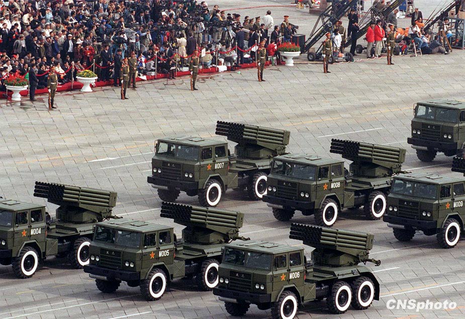 圖為1999年國(guó)慶閱兵中的輪式122式自行火箭炮方隊(duì)。 中新社發(fā) 任晨鳴 攝