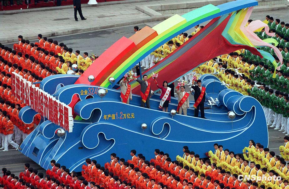 圖為1999年國慶群眾游行隊伍中的“國民經濟發(fā)展新的活力” 方陣。中新社發(fā) 任晨鳴 攝