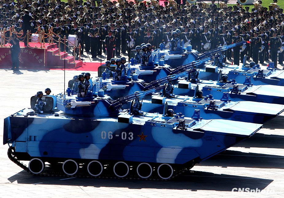 10月1日,中華人民共和國(guó)成立60周年慶祝大會(huì)在北京天安門(mén)地區(qū)及長(zhǎng)安街沿線舉行。圖為海軍05式兩棲步戰(zhàn)車方隊(duì)通過(guò)天安門(mén)廣場(chǎng)。首次亮相的05式兩棲步戰(zhàn)車是海軍陸戰(zhàn)隊(duì)新一代主戰(zhàn)裝備,信息化程度較高,安裝了先進(jìn)的火控系統(tǒng)、衛(wèi)星定位系統(tǒng)、夜視系統(tǒng)、一體化通訊系統(tǒng)等。同時(shí),步戰(zhàn)車火力系統(tǒng)得到全面提升,裝備了反坦克導(dǎo)彈、速射炮和高射機(jī)槍,能有效應(yīng)對(duì)來(lái)自坦克和直升機(jī)的威脅。中新社發(fā) 任晨鳴 攝