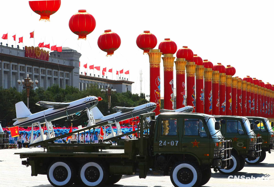 2009年10月1日,中華人民共和國(guó)成立60周年慶祝大會(huì)在北京天安門廣場(chǎng)舉行。圖為無(wú)人機(jī)方隊(duì)接受檢閱。中新社發(fā) 宋吉河 攝