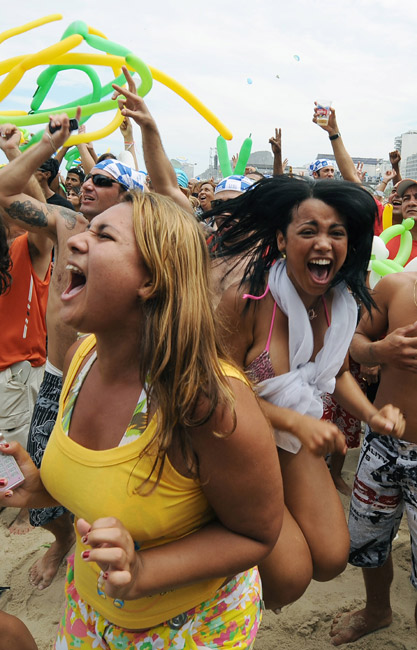 北京時(shí)間10月3日凌晨結(jié)束的2016年夏季奧運(yùn)會(huì)舉辦城市投票中,巴西里約熱內(nèi)盧經(jīng)過(guò)三輪投票,擊敗馬德里、東京和芝加哥,成功獲得了2016年奧運(yùn)會(huì)的主辦權(quán)。這將是現(xiàn)代奧林匹克運(yùn)動(dòng)自1894年首次在希臘舉辦之后,在一百多年的時(shí)間里首次來(lái)到南美洲大陸。圖為巴西民眾得知里約熱內(nèi)盧獲得2016年奧運(yùn)會(huì)主辦權(quán)后,在海灘上瘋狂歡慶。