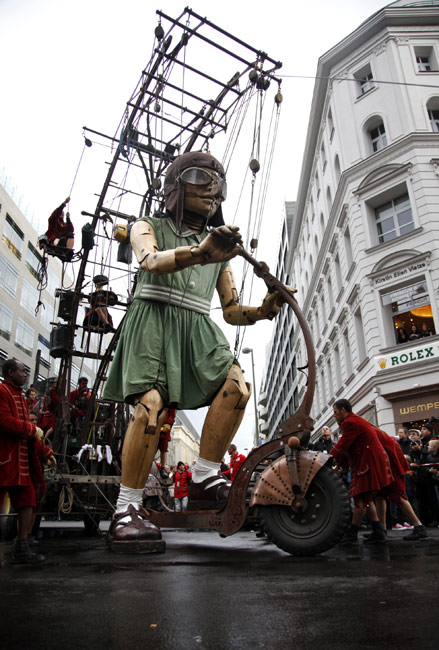10月2日,來自法國(guó)一家戲劇公司的兩個(gè)巨型提線木偶亮相柏林街頭,它們將在露天劇場(chǎng)進(jìn)行表演,以此紀(jì)念柏林墻推倒20周年。圖片來源:中國(guó)新聞網(wǎng)